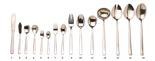 | Available in set - 1.Monoblock Knife, 2.Butter Knife, 3.Ice spoon, 4.Desert Spoon, 5.Fruit Fork, 6.Mocha Spoon, 7.Cake Fork, 8.Coffee Spoon, 9.Menu Fork, 10.Menu Spoon, 11.Soup Spoon, 12.Gravy Ladel, 13.Salad Fork, 14.Salad Spoon, 15.Serving Spoon MODEL: CT-07-01 |